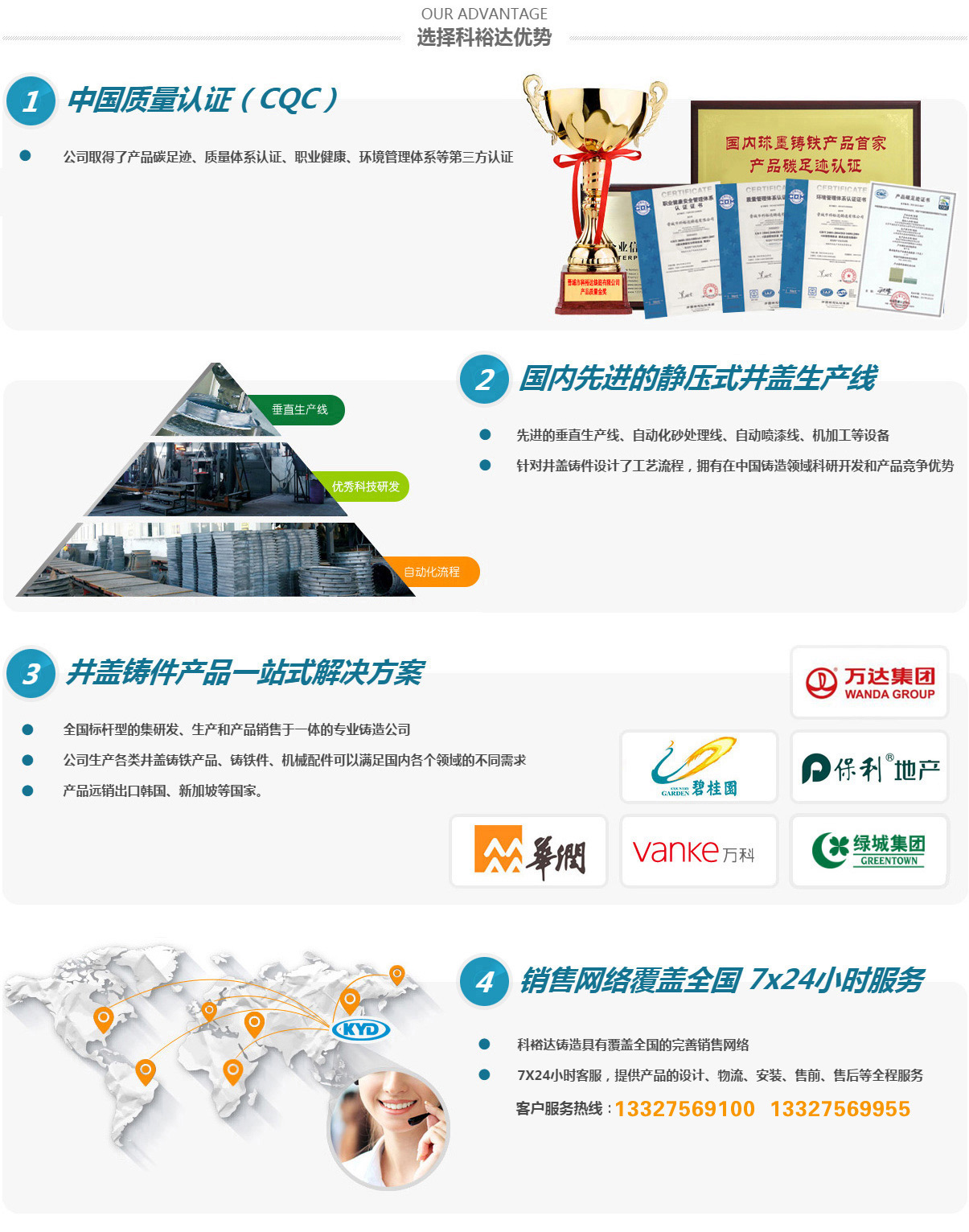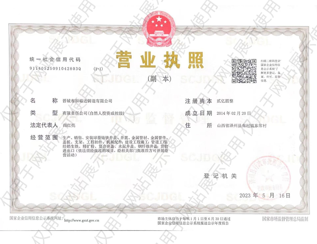 晉城市科裕達(dá)鑄造有限公司,位于山西省晉城市南村鎮(zhèn)智能綠色鑄造創(chuàng)新產(chǎn)業(yè)園區(qū),成立于2014年2月,注冊(cè)資金2億元整,產(chǎn)量10萬(wàn)噸。經(jīng)過(guò)這些來(lái)的發(fā)展,已經(jīng)成為全國(guó)集研發(fā)、生產(chǎn)、銷(xiāo)售各類(lèi)球墨鑄鐵井蓋、箅子產(chǎn)品于一體的專(zhuān)業(yè)鑄造公司,是已知國(guó)內(nèi)較大的球墨鑄鐵井蓋生產(chǎn)基地。2016年10月,公司順利通過(guò)了二級(jí)安全生產(chǎn)標(biāo)準(zhǔn)化的評(píng)審,正式成為一家二級(jí)安全生產(chǎn)標(biāo)準(zhǔn)化企業(yè)。2017年3月,山西省安全生產(chǎn)監(jiān)督管理局授予公司2016年冶金工貿(mào)行業(yè)“安全生產(chǎn)先進(jìn)單位”稱(chēng)號(hào)。2017年11月被山西省中小企業(yè)局授予“專(zhuān)精特新”中小企業(yè)榮譽(yù)。2020年8月被認(rèn)定為國(guó)家高新技術(shù)企業(yè)。2021年5月被中國(guó)鑄造協(xié)會(huì)認(rèn)定為“單項(xiàng)冠軍企業(yè)”。2021年9月被山西省中小企業(yè)局授予“專(zhuān)精特新小巨人”企業(yè)榮譽(yù)。2022年被中國(guó)鑄造協(xié)會(huì)認(rèn)定為第四屆鑄造行業(yè)排頭兵企業(yè)。2023年7月被工信部認(rèn)定為“國(guó)家級(jí)專(zhuān)精特新小巨人”企業(yè)榮譽(yù)。2024年被省工信廳認(rèn)定有“省級(jí)綠色工廠(chǎng)”及“省級(jí)企業(yè)技術(shù)中心”。