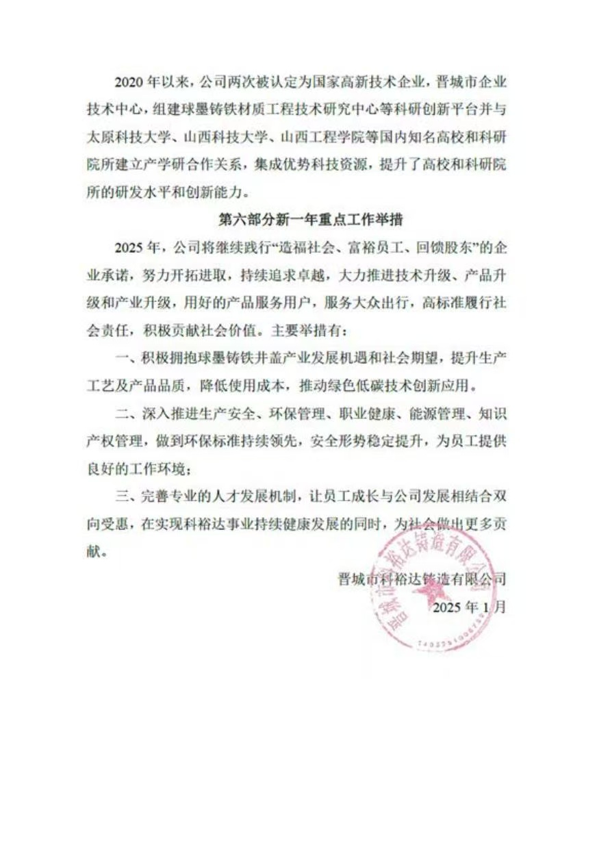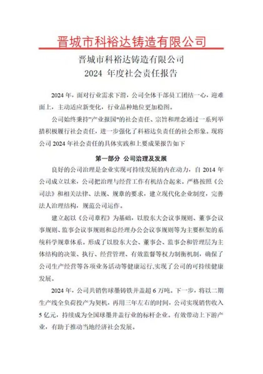 晉城市科裕達(dá)鑄造有限公司2024年度社會(huì)責(zé)任報(bào)告